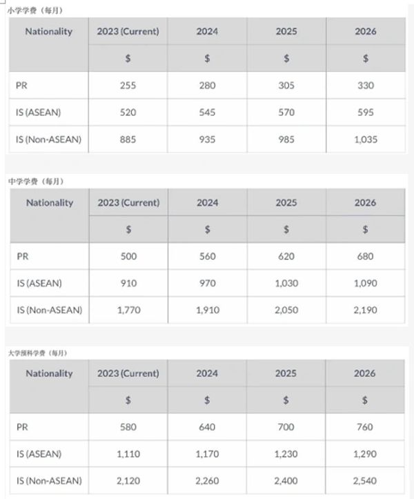 新加坡对于外国学生,东盟国家学生,永久居民学生,及新加坡公民收取不一样的学费,见左图。